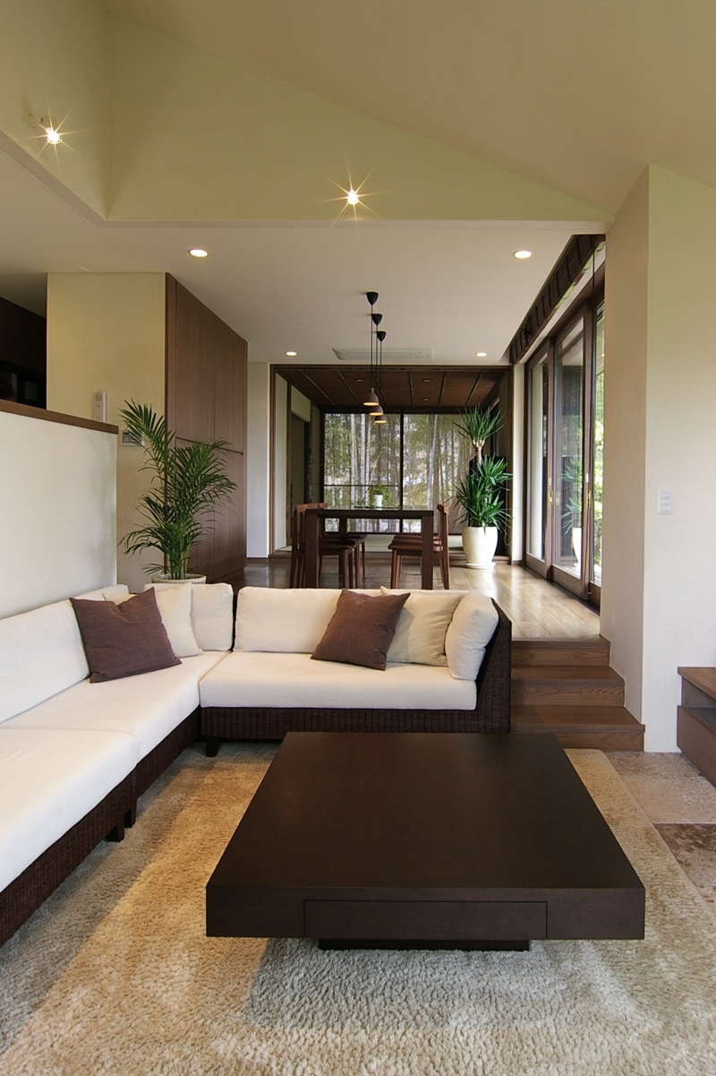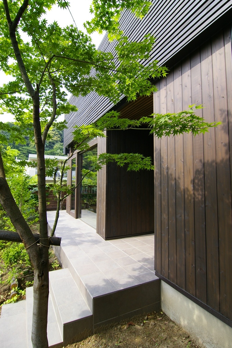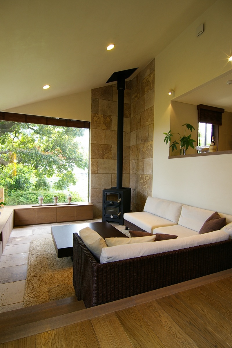 緑豊かな傾斜地を活かし、風景に溶け込む家。 大きな窓で自然とつながり、どこにいても森の中にいるような心地よさを感じられます。 自然素材を使い四季の移ろいに寄り添う暮らし。 窓を開け風を取り込み、冬には薪ストーブがやわらかな暖かさで家全体を包み込みます。 自然と共に生きる歓びを、日々の暮らしの中で感じられる住まいです。