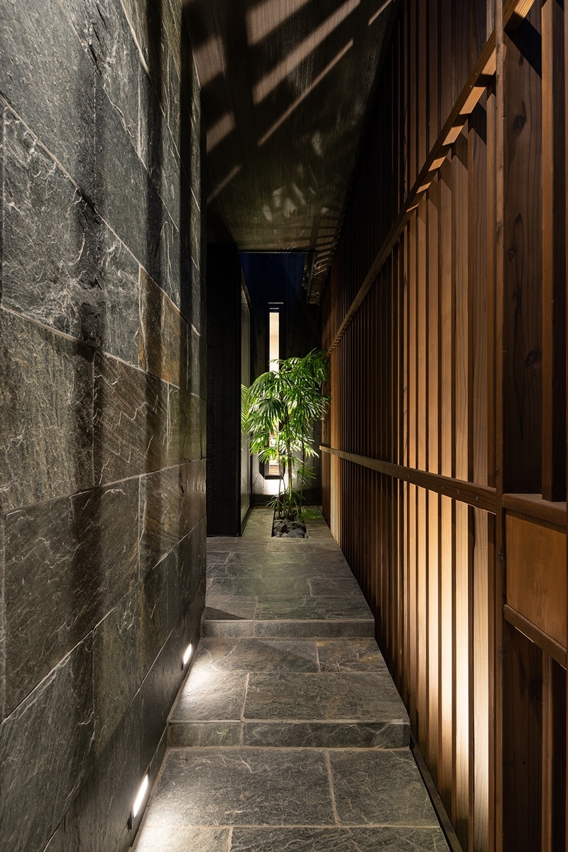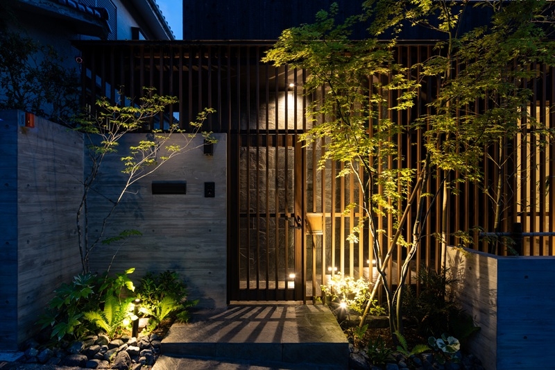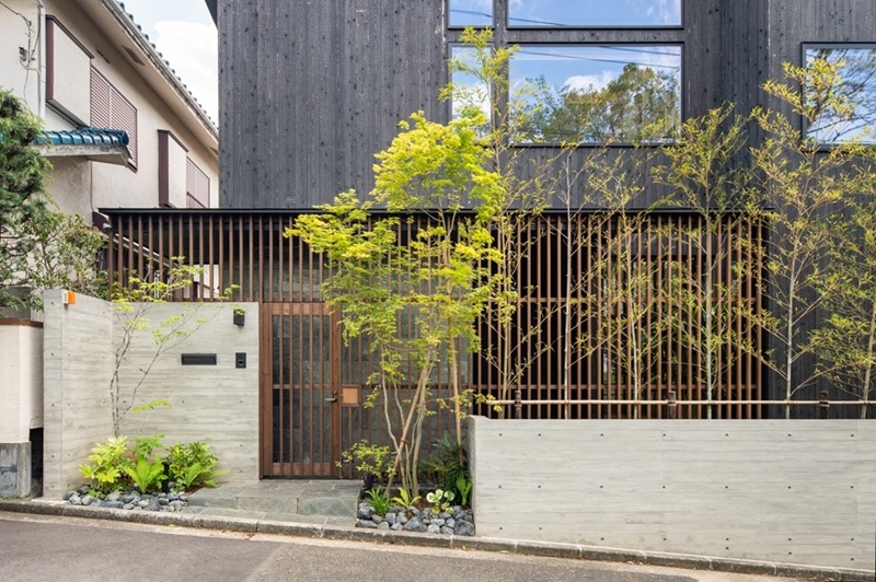 焼杉の外壁と格子に囲われたエントランスが印象的な外観です。敷地は東西に高低差があり、北側接道で、道路の対面には大きな桜のある公園があります。