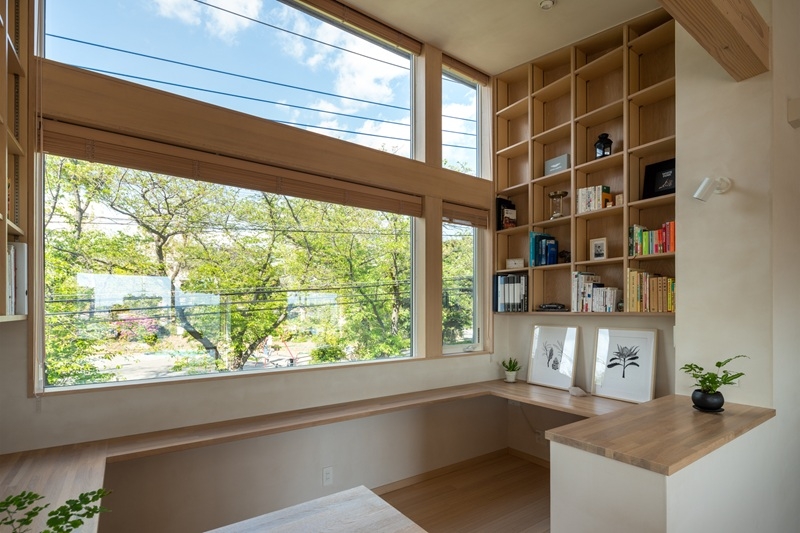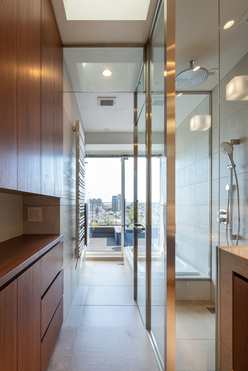 LDK、ベットルーム、バスルームはすべてテラスと繋がり、眺望を楽しむ事が出来ます。またLDKに繋がる書斎からも公園の木々が借景でき、遠い景色と近くの緑を同時に楽しむ事が出来ます。