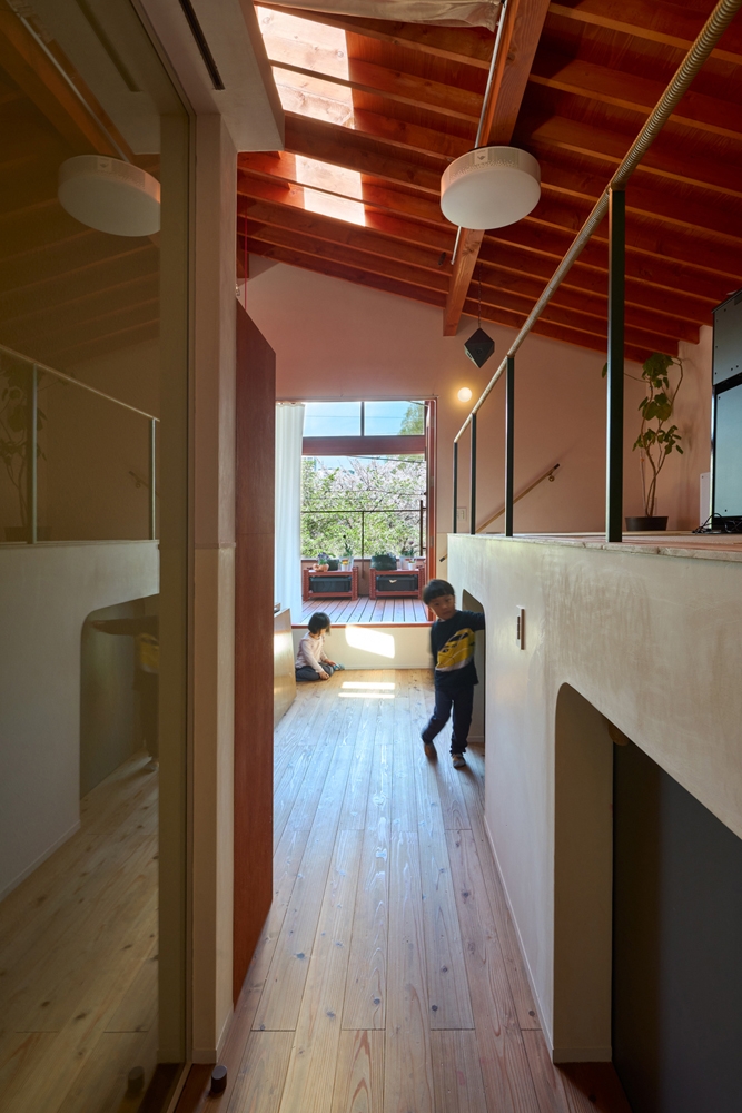 洗面がある通路からは前面の公園に向かって一直線に視線が通り抜けるようになっており、さらに、杉板の高い勾配天井と、アッパーライトに照らされた漆喰の壁がこの家の解放感をより一層高めています。
