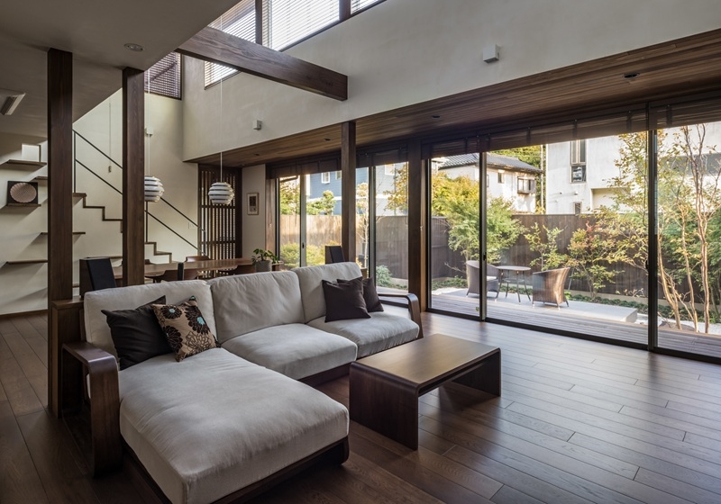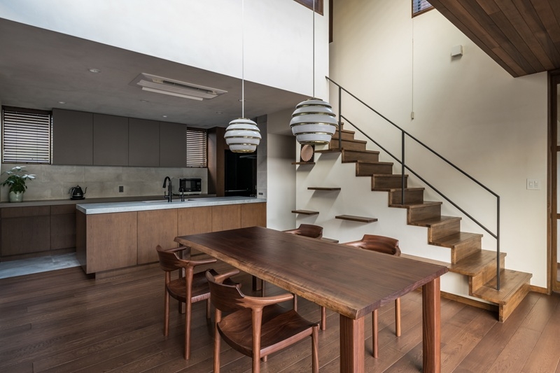 1階のリビング、ダイニングは吹き抜け空間となっています。掃き出し窓は庭との一体感を強め、高窓からは光を奥深く取り込みます。軒の深さが四季に応じた日差しの量をコントロールしてくれます。