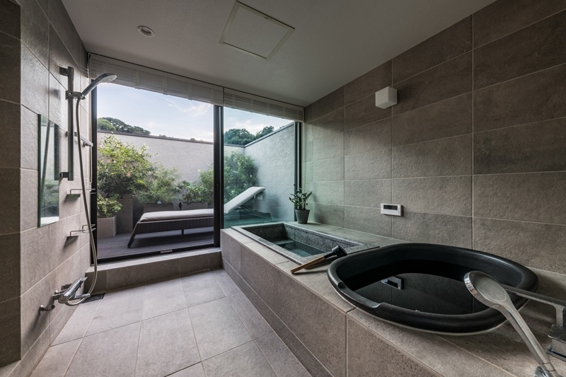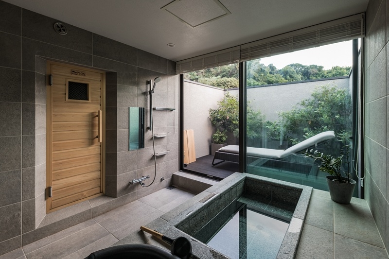 2階には寝室や水廻りスペースを配置しました。浴室にはサウナと陶器の水風呂、和風呂を設置し、外のテラスで涼むことも出来ます。ちょっとした非日常を味わえる贅沢な空間となりました。