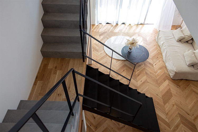 階段上部には大きなFIX窓により採光をLDK全体に行き届かせている