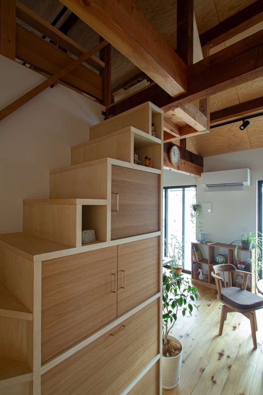 古い箱階段を模して作っても、侘び感は出ないですが、箱階段らしい意匠にしたいなと、枠部分を白木のシナ合板。引出し部分を中間色のナラ材と異なる色彩の樹種とする事で、京町屋にある箱階段の太い枠と引出しの凹凸感を見出した設計としました。