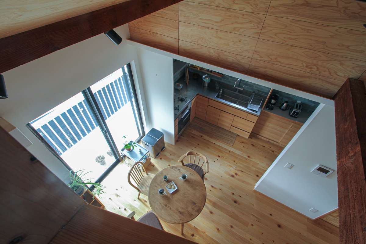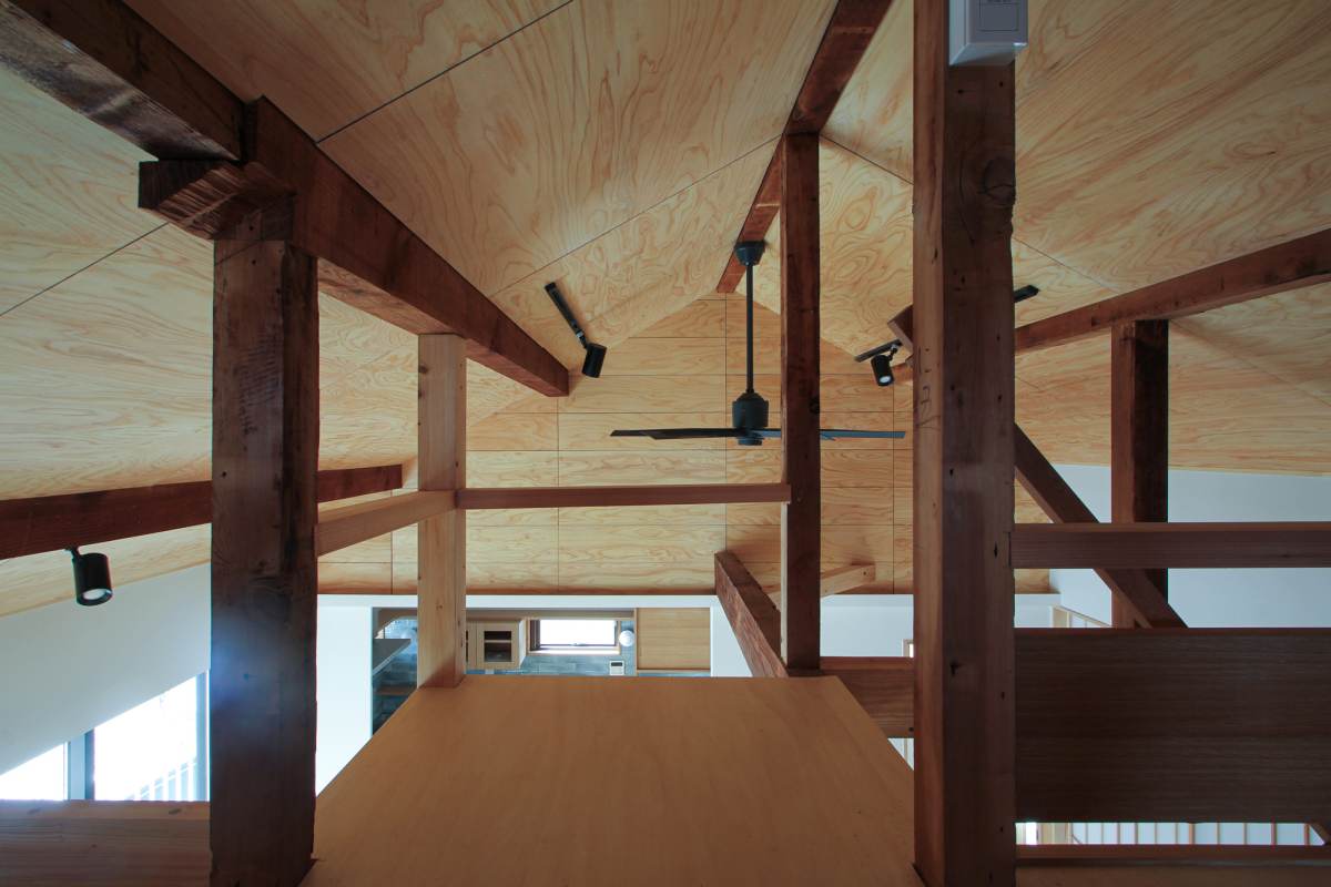 天井裏に隠されていた小屋裏収納部分の、壁・天井をとりさり吹抜けにつながる、ロフトにする事で、リビングから視線の抜け感のある伸びやかな家に設計しました。ロフトの床を一部無くす事で、下のリビングから上のロフトに光が上がり明るいロフト空間になっています。