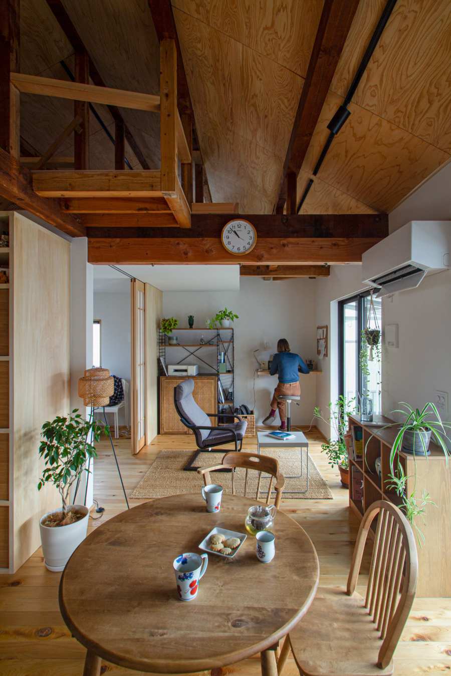 天井を撤去したことで現れてくる、古材の梁。変に磨かずオイルを塗るだけにして、凹凸のある素材感を感じられ、木立の中にいるかの様な住まいです。ヒノキ合板の天井、杉材と和紙で作った障子、青森ヒバの無垢フローリングなど、オーガニックで和の要素も入った、ジャパンディなインテリアになりました。