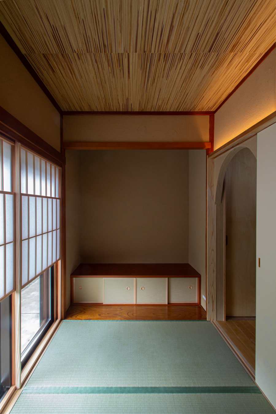 工事前の調整段階で大きく変更したのですが、6畳の和室を3畳+床の間の和室に減築。その分、土間スペースを大きくし、自転車がおけたり、ちょっとしたDIY的な作業が出来る場所にしています。小さくした和室は小間のお茶室の様に、その小ささがすごく居心地よい場所になりました。