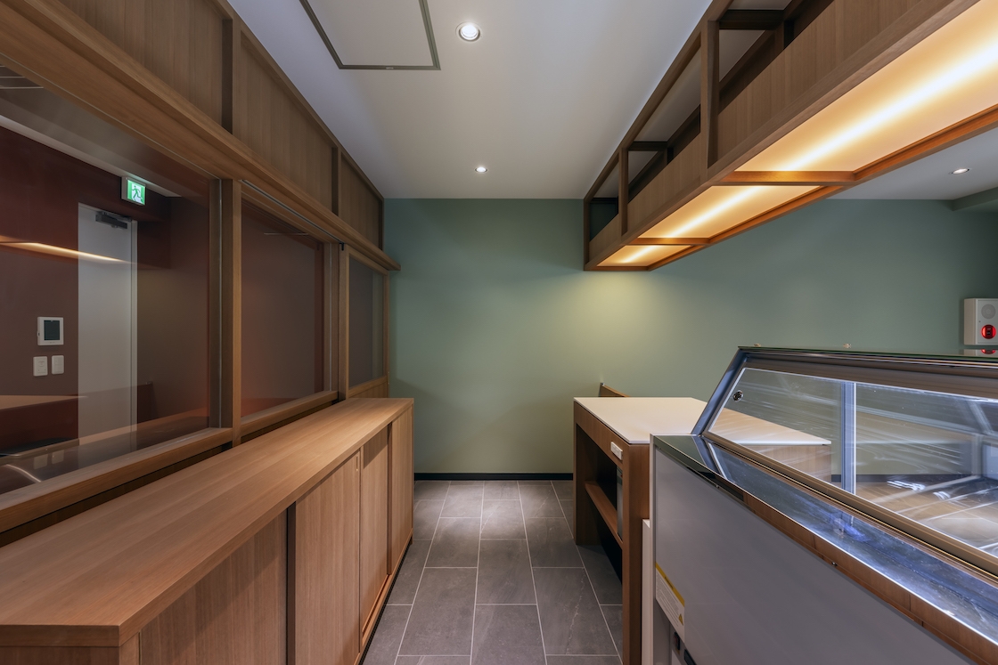 本プロジェクトはいわゆる居抜きの店舗であり、外壁タイルやドアが形づくる黒系統のファサードに内装のトーンを合わせていく必要があった。加えて、商品である冷菓の印象や求められている落ち着いた雰囲気を手掛かりに検討する中で、自然と彩度やトーンを抑えた空間イメージが立ち現れた。