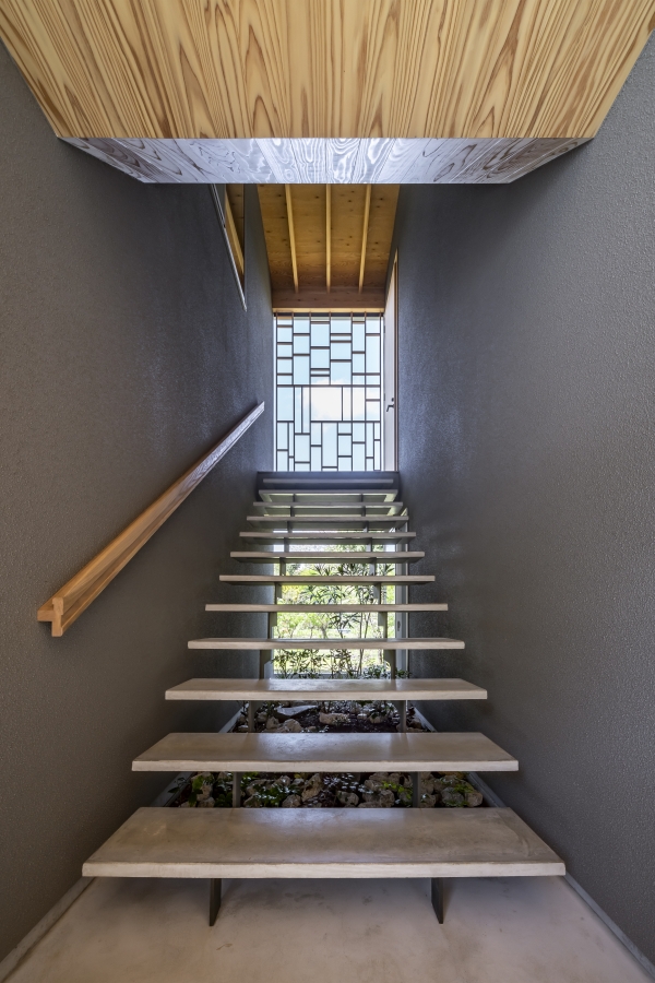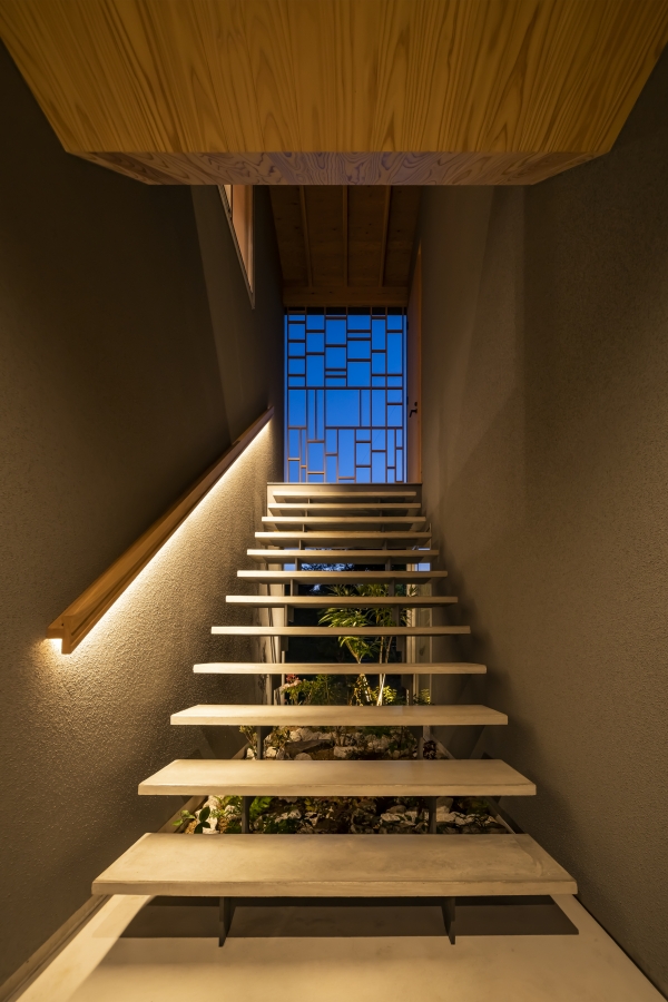 住居エリアへ通ずる屋外階段部分は洞窟の様な仄暗い緩衝空間とし、視覚的にも仕事エリアとの分断を意識できるようにしました。