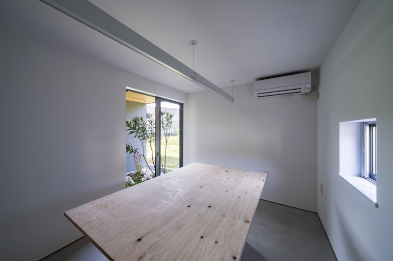 また階段下に植栽をほどこし半屋外空間とした事で、建物奥にある事務所側からもそのスペースを中庭として感じられるようにしました。