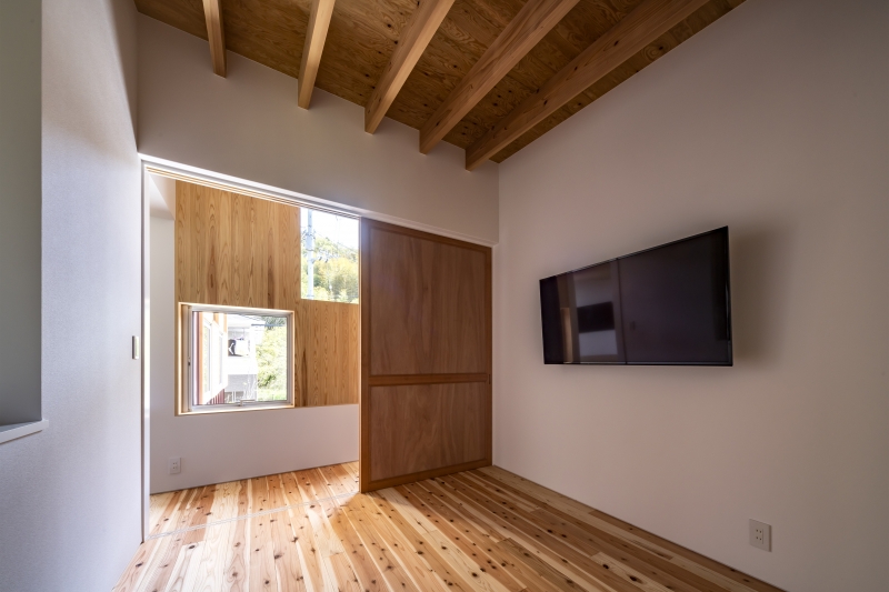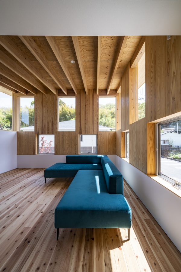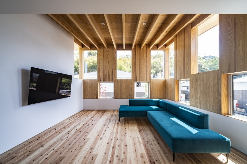 2階住居では、周囲の住宅の屋根越しに見える景色を最大限取り込むことが可能な様に、パノラマ状の窓を配置しました。