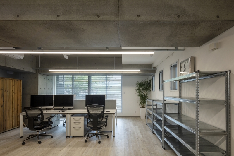 1階は駐車場・駐輪場、5階には、社員そろってBBQ・・・屋上広場を設け、2~4階を事務所スペースとしている。
