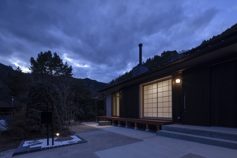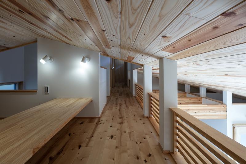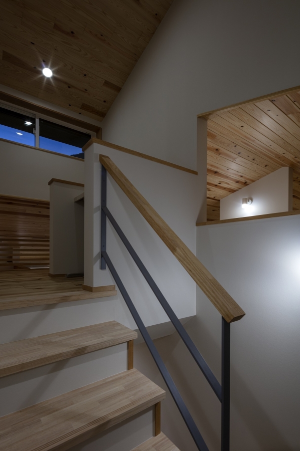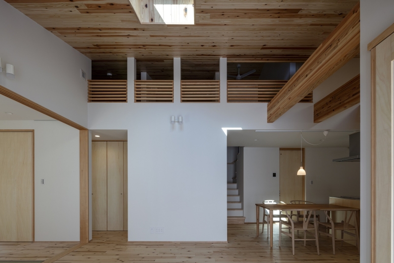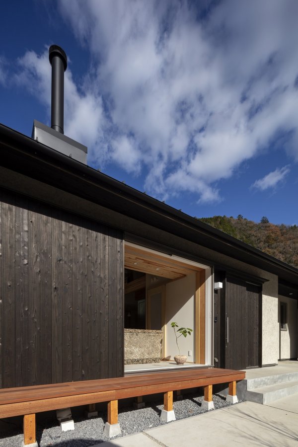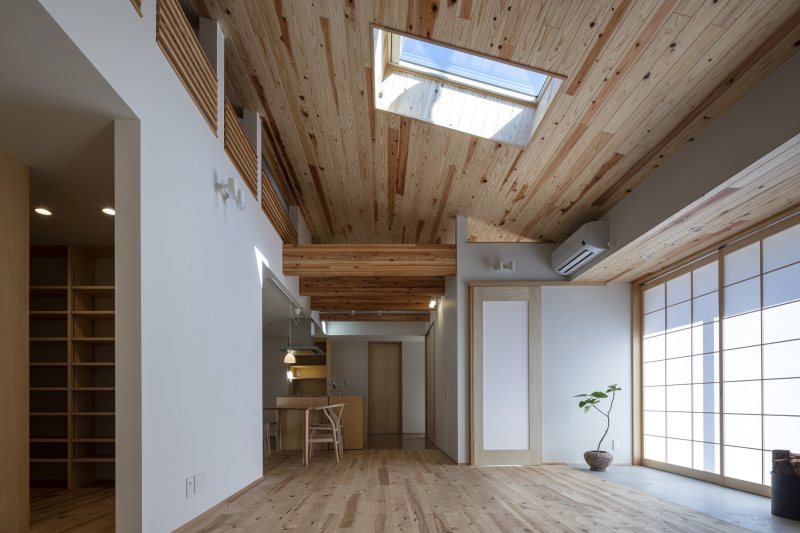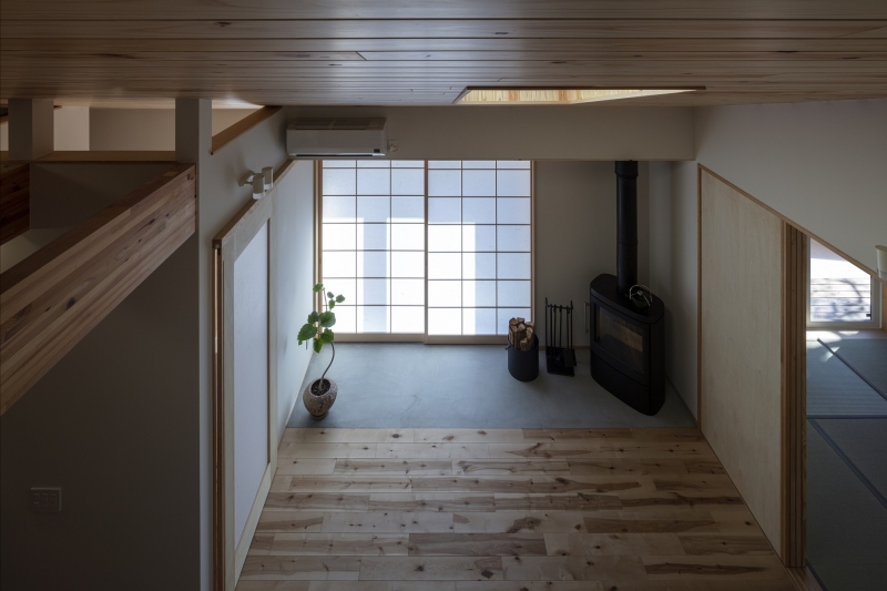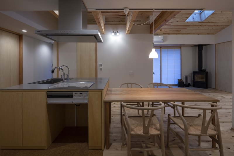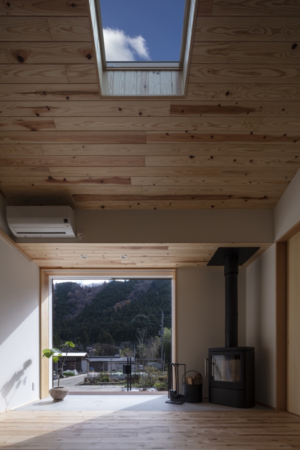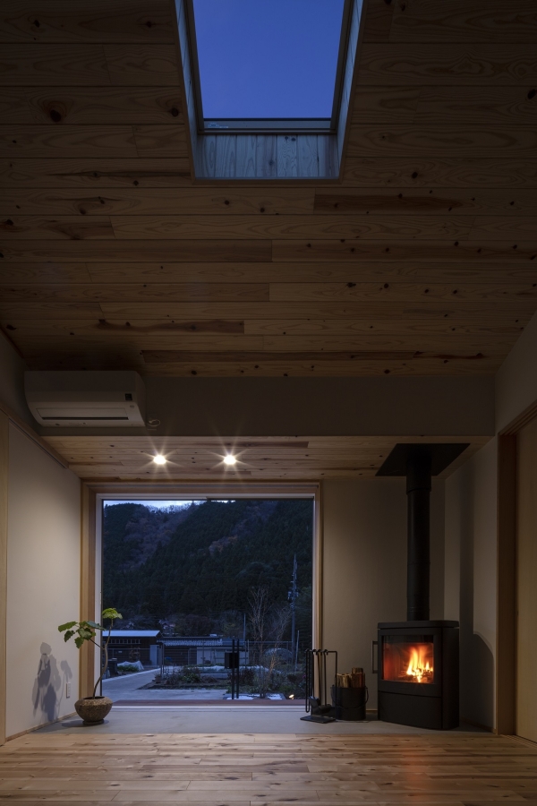 築50年ほどの住宅の建て替え。 LDKに天窓や庭に面した大開口を設けることで外の景色や日の光を取り込み、開放的で明るい室内空間を実現した。寒冷地ということもあり、高気密高断熱住宅とし、空調負荷の低減を図った。夏の日射は庇でカットし、冬は太陽高度が低いため室内まで日射を取り入れる。リビングの南側には蓄熱の土間も設置。それにより冬は薪ストーブ一台で家全体の暖房を賄うことができる。