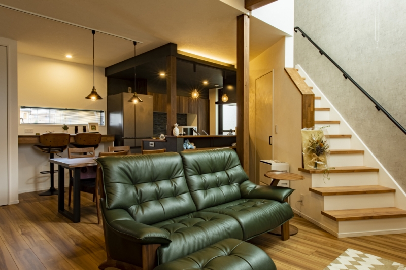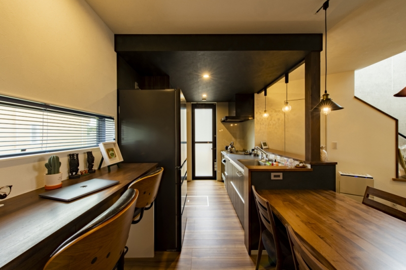ダークモダンな色あいに木のぬくもりが感じられる空間が広がります。 間取りはLDKですが、キッチンはあえて天井を一段下げ、担当の提案で天井と壁をブラックに。 こうすることで、キッチンが空間的には一体なのに、独立した特別な空間の様に感じられます。