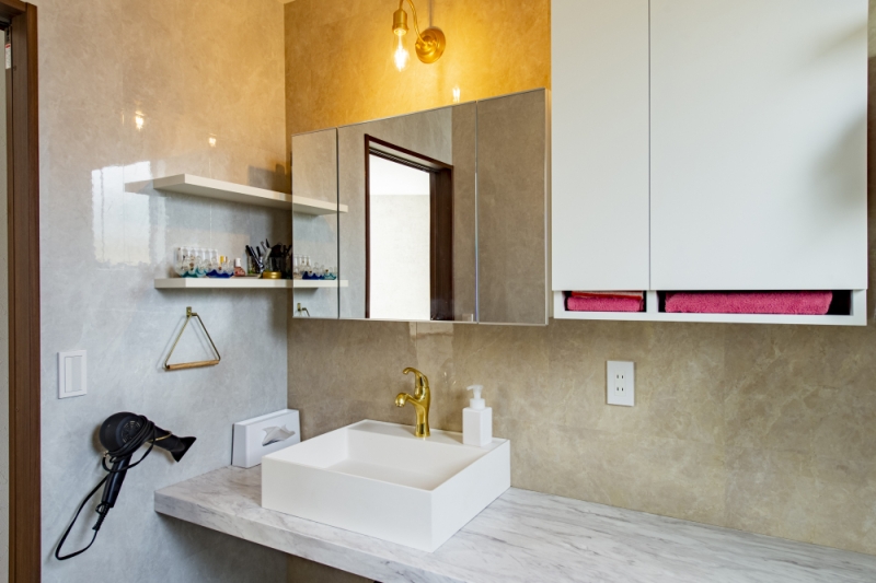 すべてが大理石調の洗面脱衣所。 日常空間がまるでホテルのようなラグジュアリー空間に。 お風呂に入るのも、お洗濯するのも、毎日の歯磨き、洗顔、ヘアセットも、この空間なら楽しんでいただけますね。