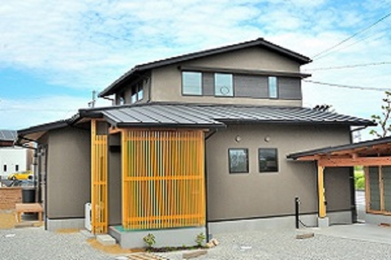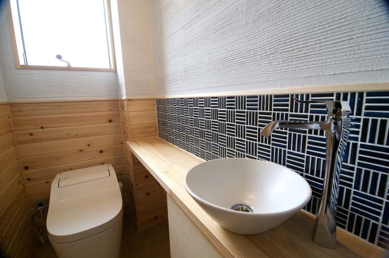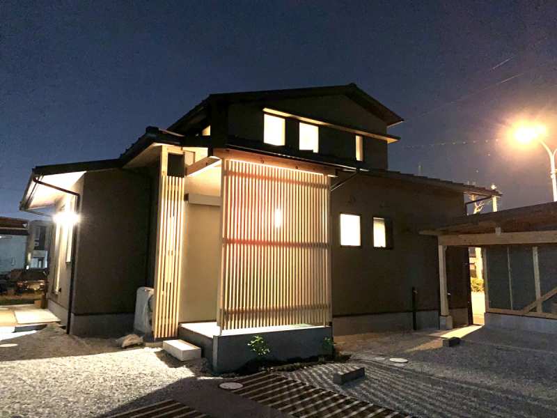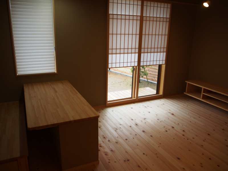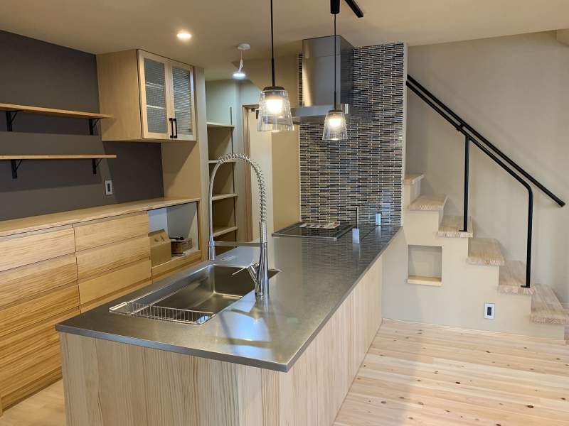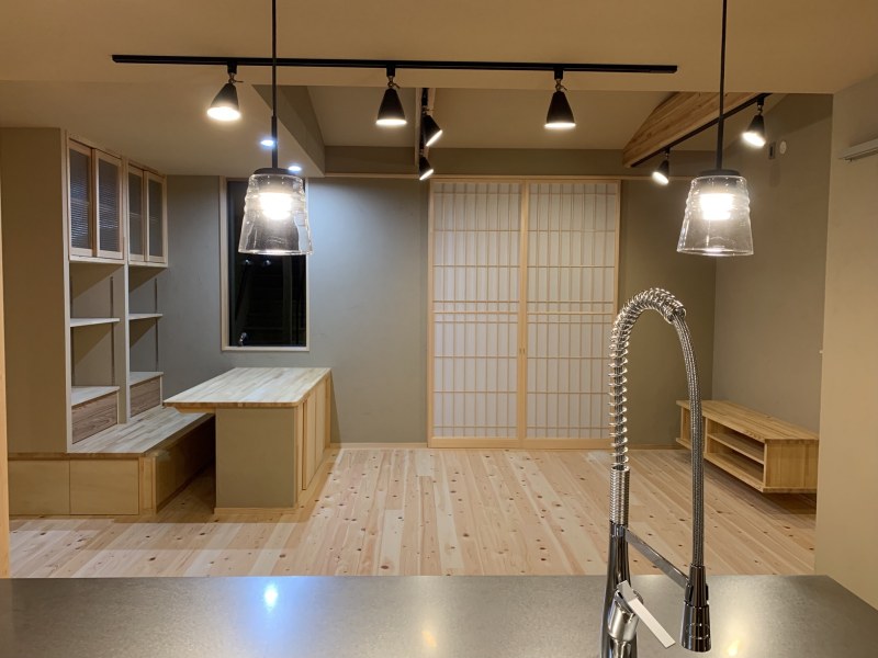 雪見障子からは庭がチラリと見えます。 リビングにはスタディカウンター。 子供と大人が広々と一緒に勉強ができます。 キッチンはあえて白を使わず落ち着いた雰囲気にインテリアコーディネート。 家族がそれぞれ好きなことをしながら、同じ空間で緩やかに過ごす家です。