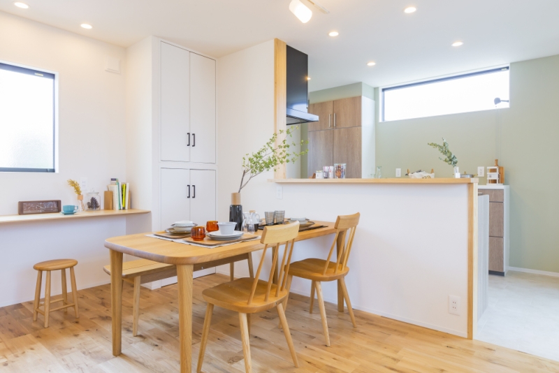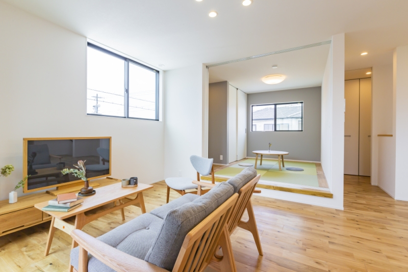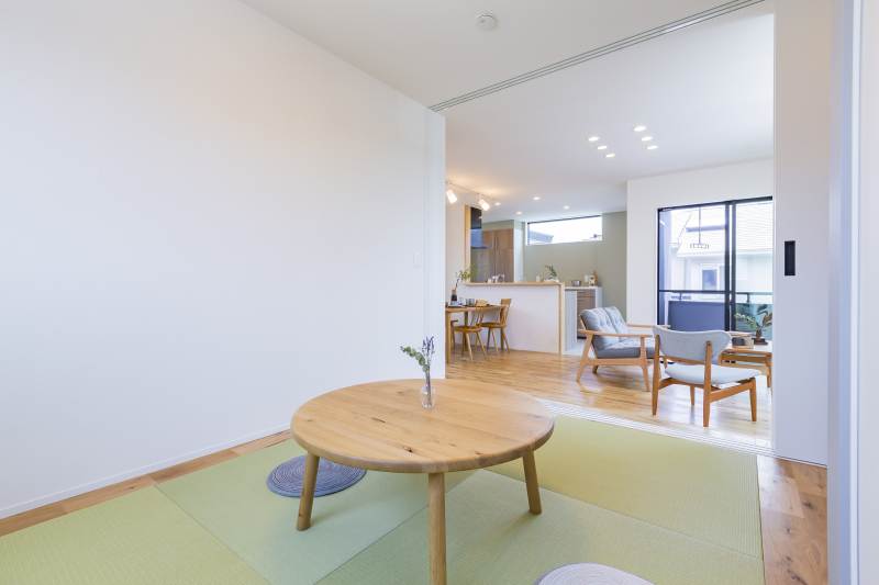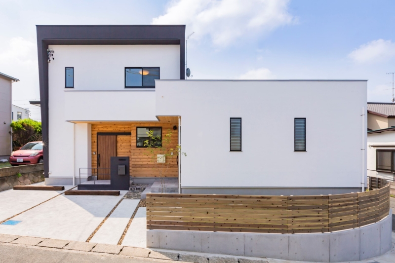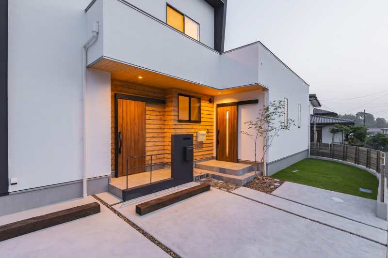 白と黒のコントラストに、木のアクセントが映えるモダンなデザイン。 このお家で二世帯のご家族が仲良く、ステキに、楽しく暮らしていただけますように。 L型の建物を活かした玄関の配置、エントランスに温かみが生まれました。