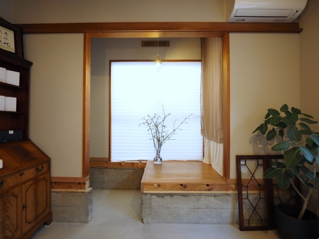 既存の建物は住宅として使われていたため、出入り口に段差がありました。敷地条件や既存建物の構造上、段差を完全に解消することは難しかったため、無理にフラットにするのではなく、高齢の方でも上がりやすい高さのステップを設けることで、できるだけ負担の少ないアプローチとしました。