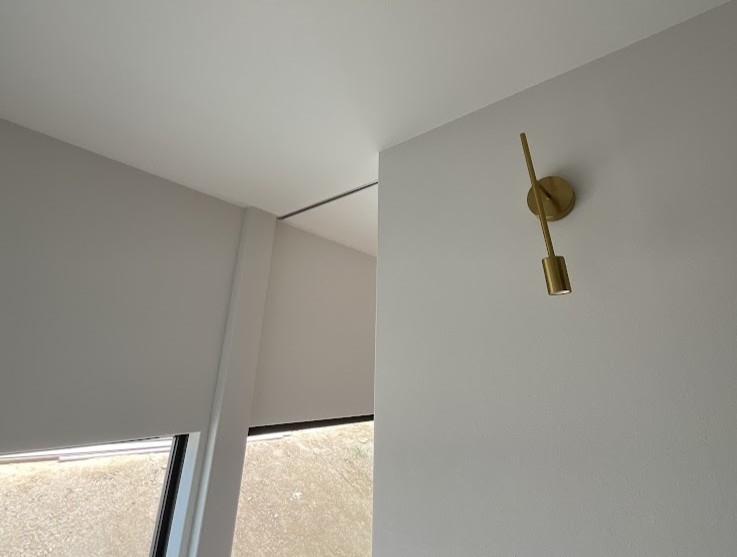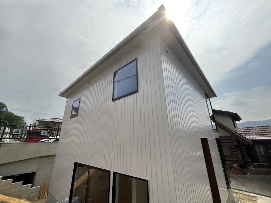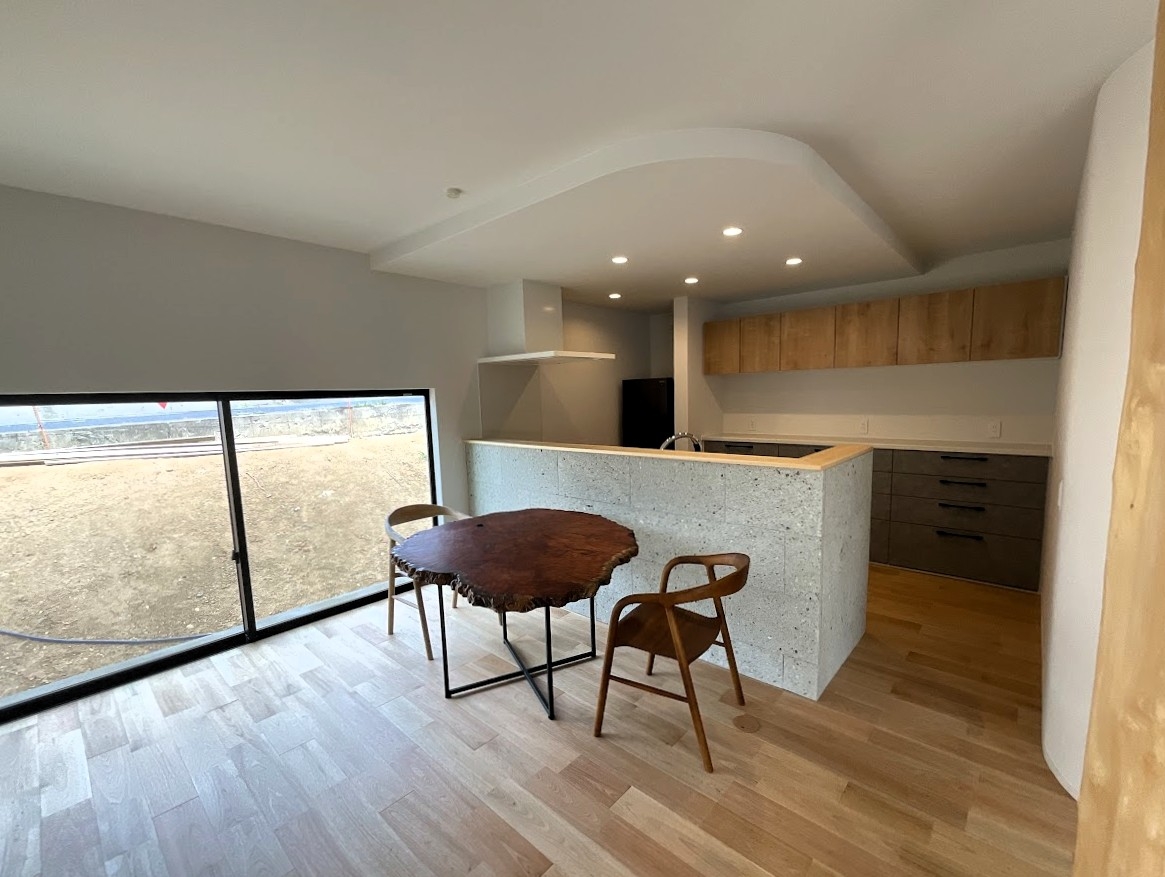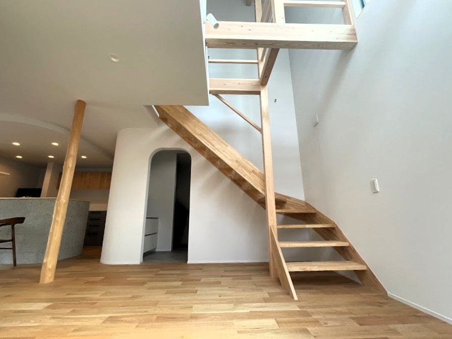 道路から一段下がる、限られた面積の計画地。ここで大切にしたのは、二つの要素だった。 ひとつは、道路からの視線を外して切り取る大きな開口。 もうひとつは、LDKと廊下を一体化させた、正方形のシンプルな間取りである。 簡潔で機能的な骨格に、曲線(R)を用いた柔らかな内装と、木や大理石の素材感を重ねた。 外観は道路からの見え方を意識し、方形屋根が印象に残る端正な佇まいとしている。