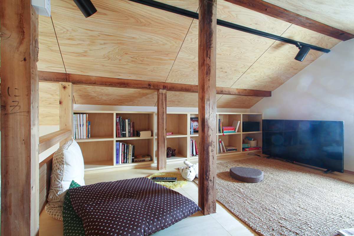 天井裏に隠されていた小屋裏収納部分の、壁・天井をとりさり吹抜けにつながる、ロフトにする事で、リビングから視線の抜け感のある伸びやかな家に設計しました。ロフトの床を一部無くす事で、下のリビングから上のロフトに光が上がり明るいロフト空間になっています。