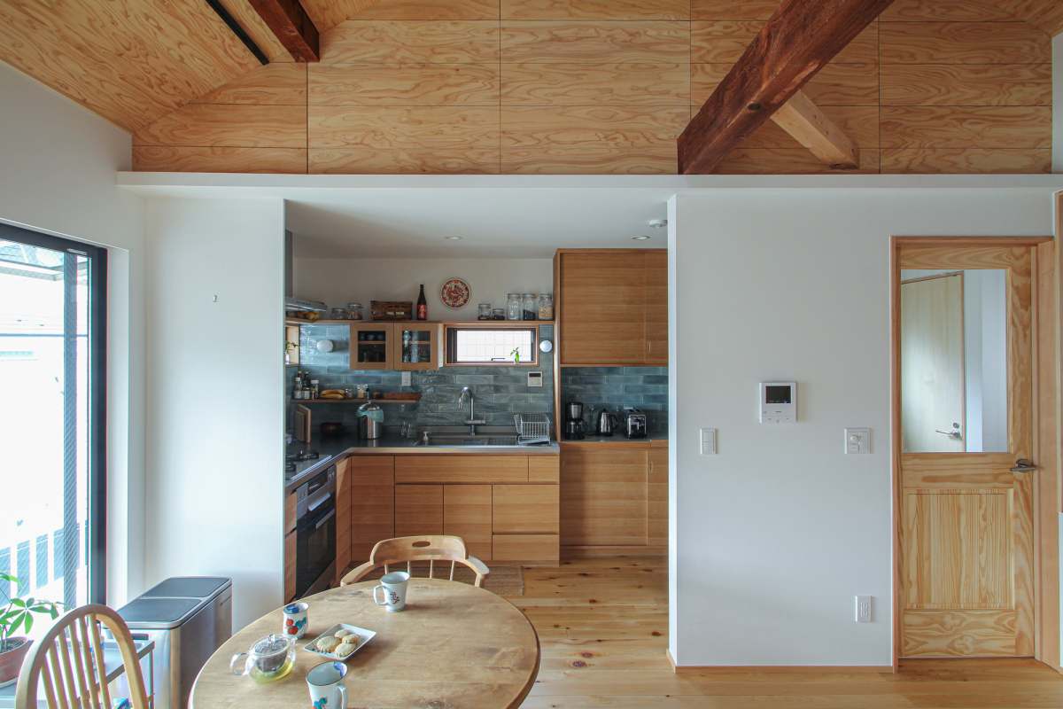 天井を撤去したことで現れてくる、古材の梁。変に磨かずオイルを塗るだけにして、凹凸のある素材感を感じられ、木立の中にいるかの様な住まいです。ヒノキ合板の天井、杉材と和紙で作った障子、青森ヒバの無垢フローリングなど、オーガニックで和の要素も入った、ジャパンディなインテリアになりました。
