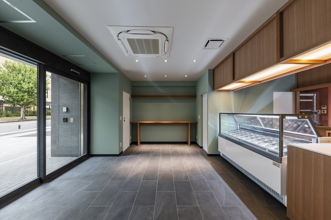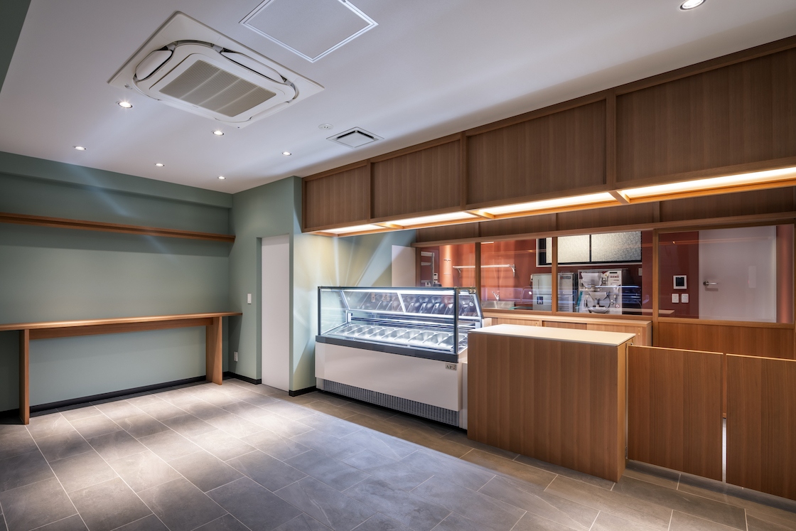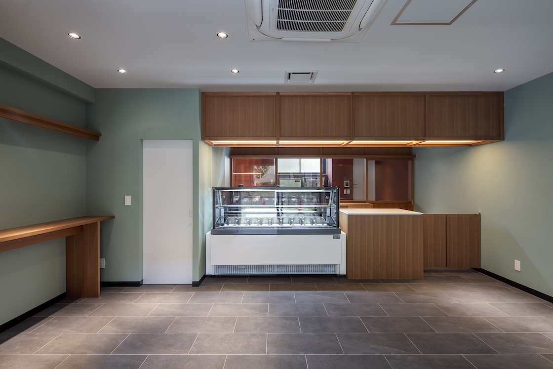 本プロジェクトはいわゆる居抜きの店舗であり、外壁タイルやドアが形づくる黒系統のファサードに内装のトーンを合わせていく必要があった。加えて、商品である冷菓の印象や求められている落ち着いた雰囲気を手掛かりに検討する中で、自然と彩度やトーンを抑えた空間イメージが立ち現れた。