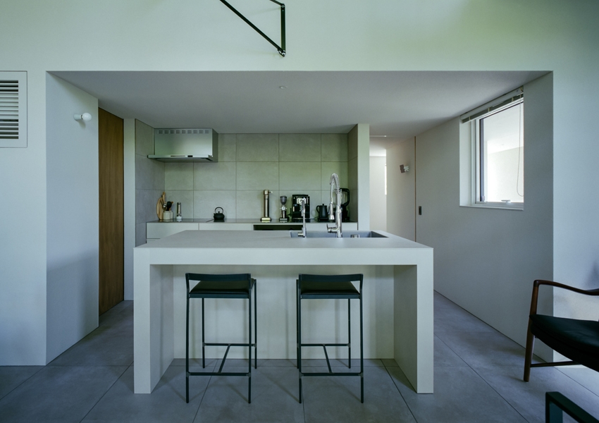 キッチンから見ると、リビングが浮いたように見える空間、