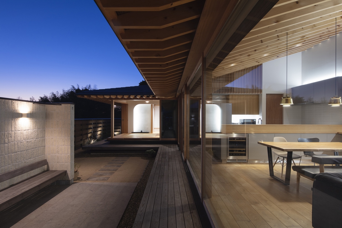 形態的な特徴は、伸びやかに連続する濡縁と庇、室内から軒先へと張り出す現しの垂木、軒を低く抑えたプロポーション、大開口の木製建具、、、機能的な特徴は、造作キッチンと繋がる家事動線、坪庭に面した露天風呂感覚の浴室、和室と一体となったロフト空間、ベンチや流しを設えたBBQテラス、外動線としての露地庭、基礎の輻射熱を活かして家全体を暖める蓄熱式床暖房、、、素材的な特徴は、木の産地ならではの紀州ヒノキ、天井に貼られた染極細葭茶糸編、重厚な幅広オーク床材、和室縁甲板のナグリ、神代の趣感じるウッドデッキ、素朴な風合いの手づくりタイル、柔らかな表情の芦野石、大津磨きの左官、華やかで重厚な漆和紙、市松の襖、そっと忍ばせた真鍮や和風金物、エッジの利いた板金、、、等々。大工、職人、素材生産者方々の技術や心意気を紡いだ住宅です。