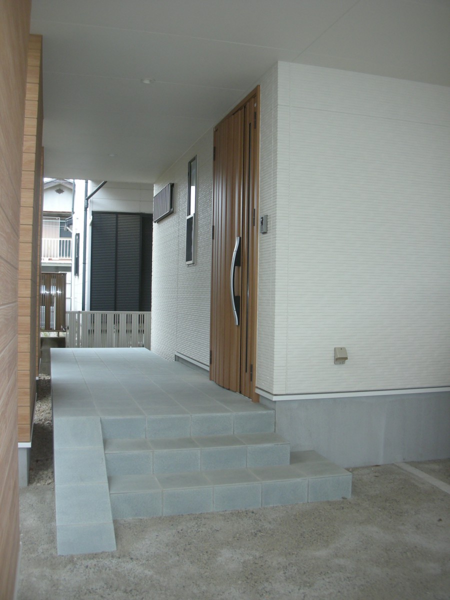 太陽光を設置すため片流れの緩勾配屋根。駐車場を建物と一体。ベランダの一部をルーバーとすることで、風通しと見た目の軽やかさが得られました。
